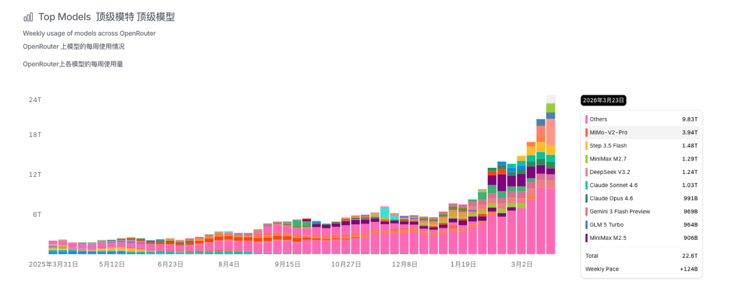 3月30日,据专家大模子团聚路由平台OpenRouter,上周(3.23-3.29)专家模子调用量名次榜中,国产大模子调用量带领一个月向上国外模子。