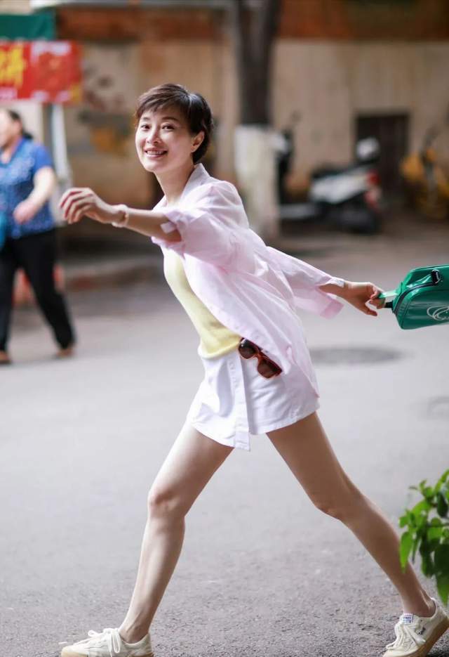 她今天53岁勒,可这个气象那处像,周身皆散漫着一种芳华的气味,白短裙,粉衬衫,淡黄的打底,加上这健好意思的长腿,配上小白鞋,好阳光明媚。