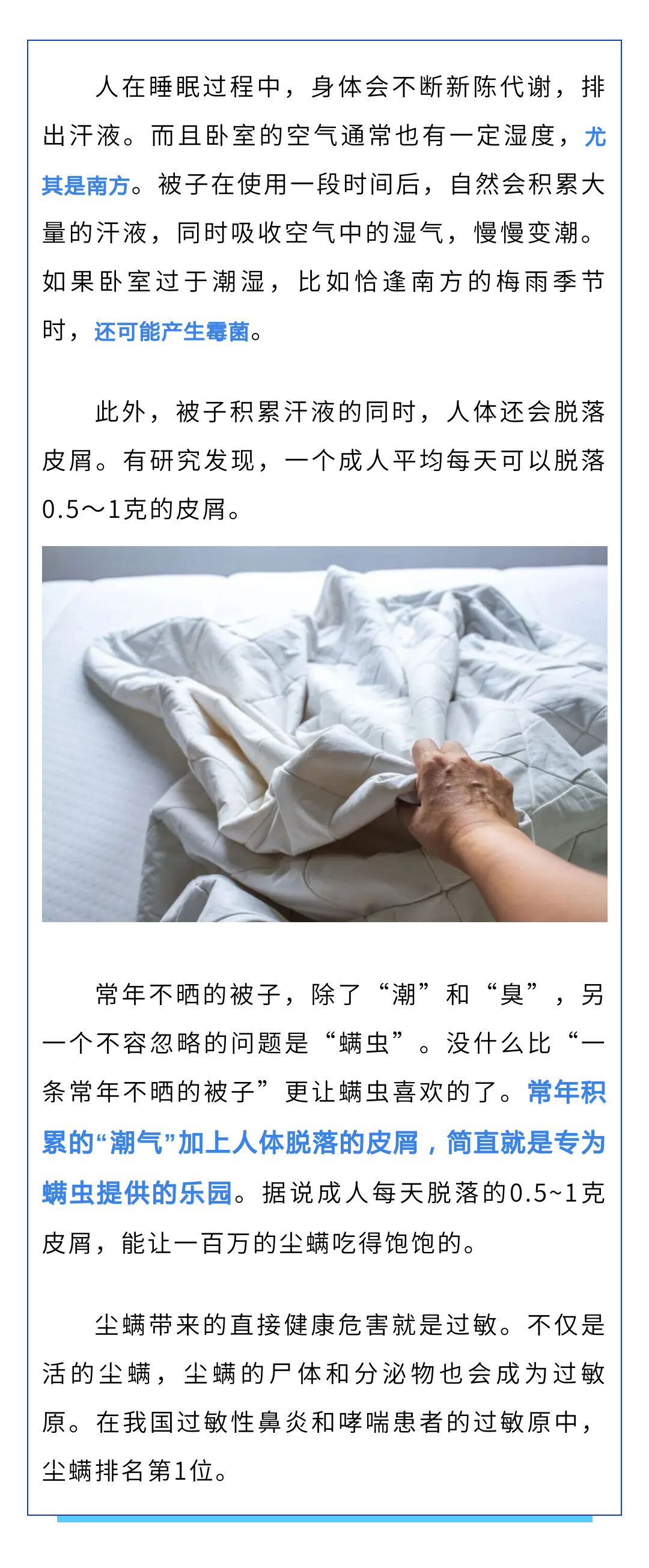 久存无须或新购被褥,用前王人要进行一次曝晒,这样不错保证被子的干燥卫生。正在使用的被褥,提出每周曝晒一次即可。