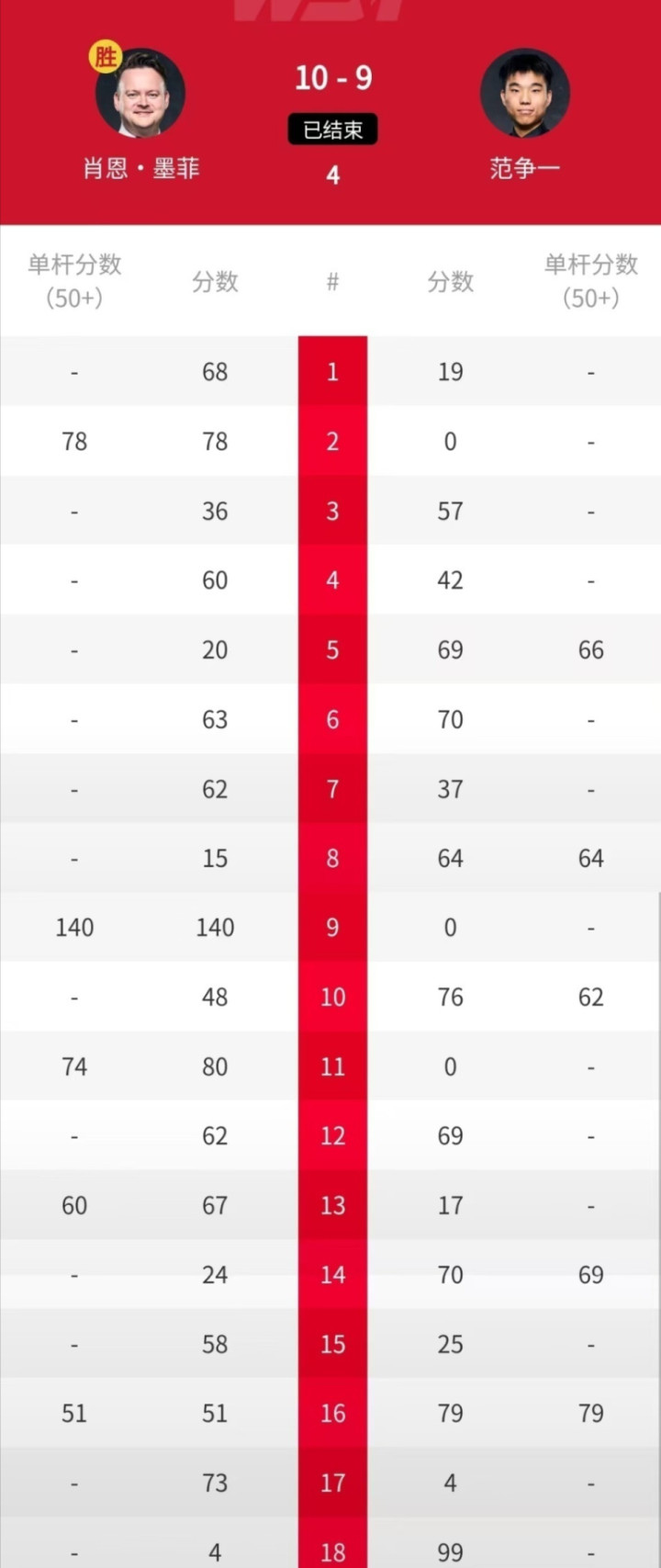 第四局,墨菲在拉锯战中以60-42再胜一局,3-1朝上。节略的局间休息回首之后,范争一打出单杆66分,69-20再扳一局,比分追成2-3。