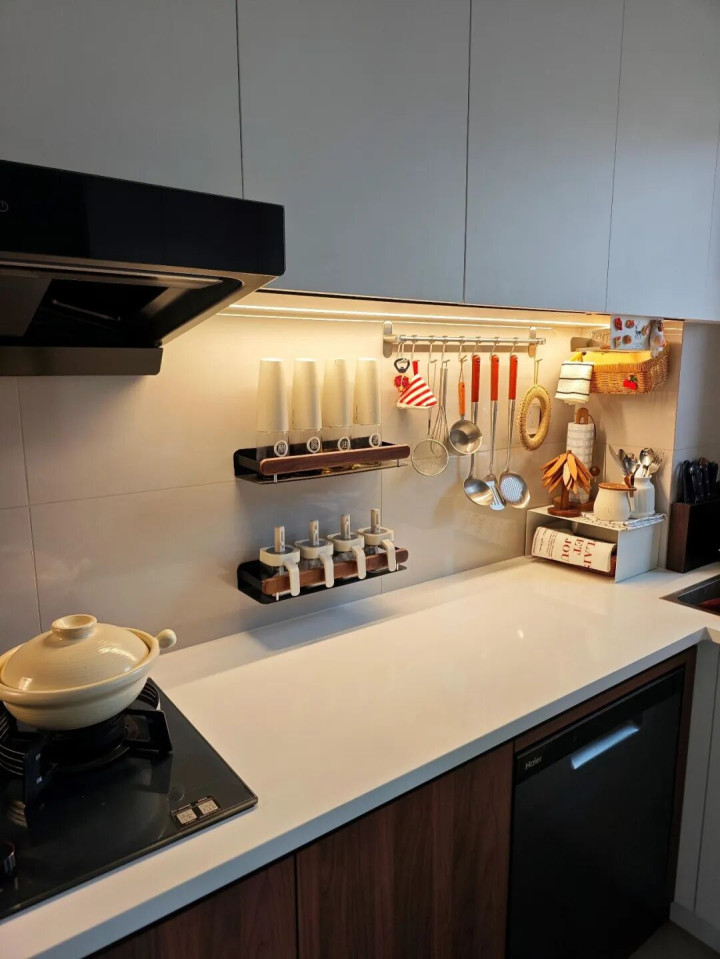 油盐酱醋,能进柜子的进柜子,能用置物架上墙的就上墙,别全摊在台面上。
