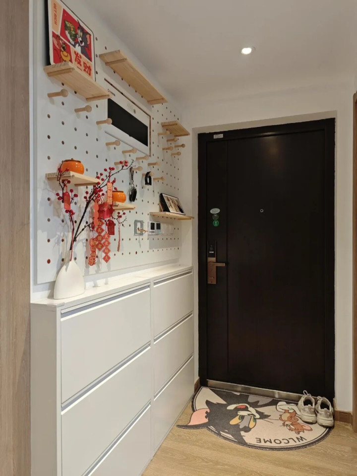 空间小的,买个超薄鞋柜也行,墙上再安排个洞洞板,外衣、包包、雨伞挂上去,不占方位还显利落。