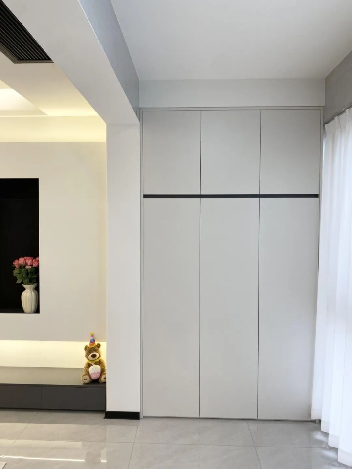 一边作念洗衣柜,把洗衣机烘干机嵌进去。另一边作念个家政柜,吸尘器、扫地机器东说念主、行李箱、致使换季的电电扇,完全塞进去。柜门一关,明昭彰白。