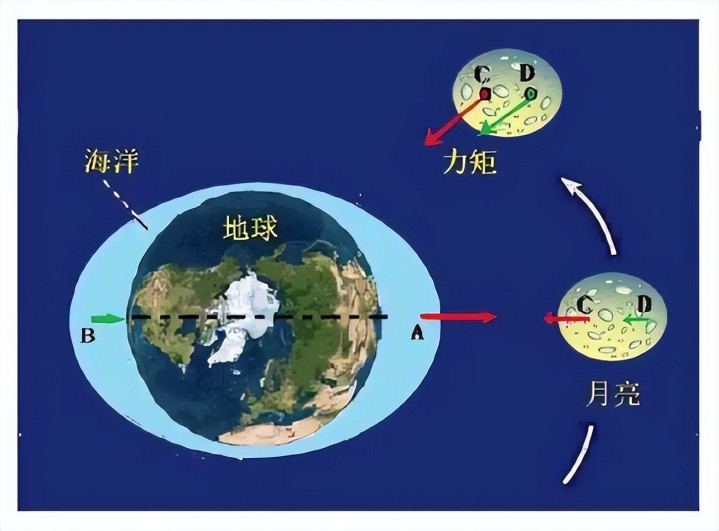 潮汐,咱们齐知谈是月球引力影响的奏凯体现,但月球对地球的引力并不是均匀漫步的,而是围聚月球的一面所受到的引力会更强,背向月球的一面受到的引力则较弱。这种引力互异会使得地球上的海洋酿成了得表情,也不错称为潮汐饱读包,而事件的要津在于,地球自转速率远快于月球公转速率,地球只需要24小时便能完成一次自转。月球则需要27天才智绕地球一圈,这意味着,当地球带着潮汐饱读包迅速旋转时,饱读包还没来得及瞄准月球,就被地球的自转“甩”到了月球的前边。