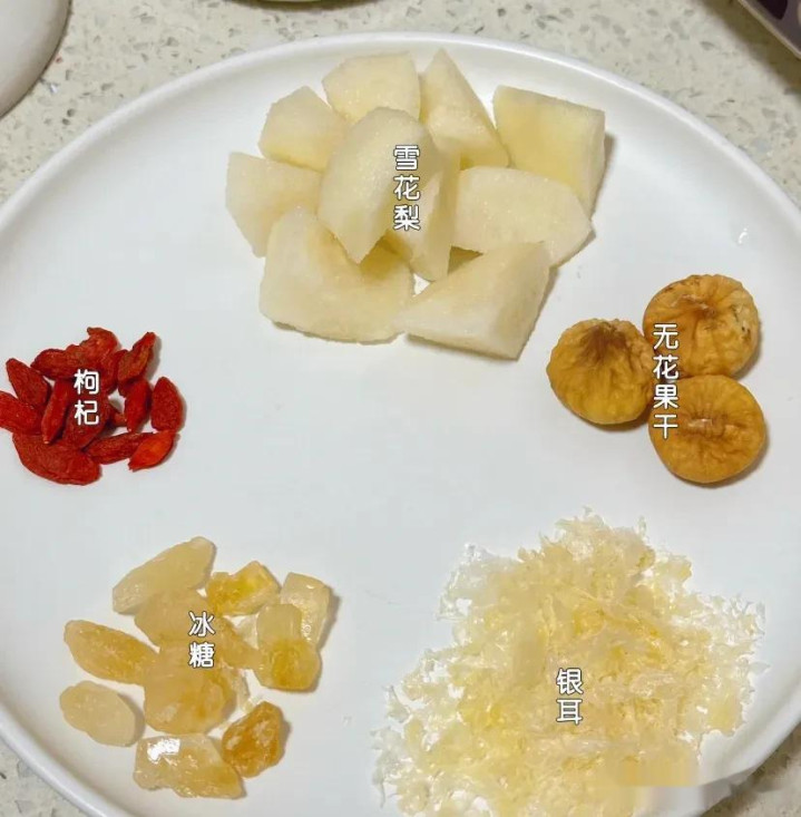 食材:无花果、雪梨、银耳、枸杞、冰糖(可加少量)