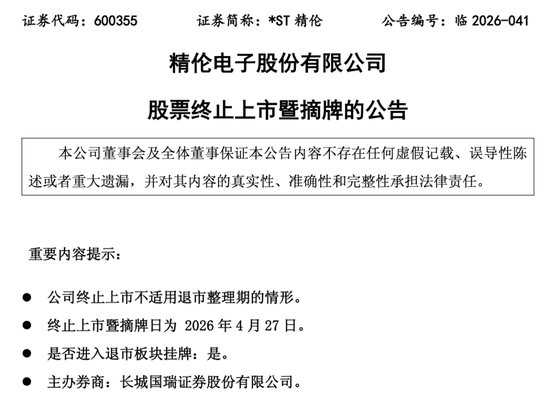 4月20日,*ST精伦发布《精伦电子股份有限公司股票圮绝上市暨摘牌的公告》。