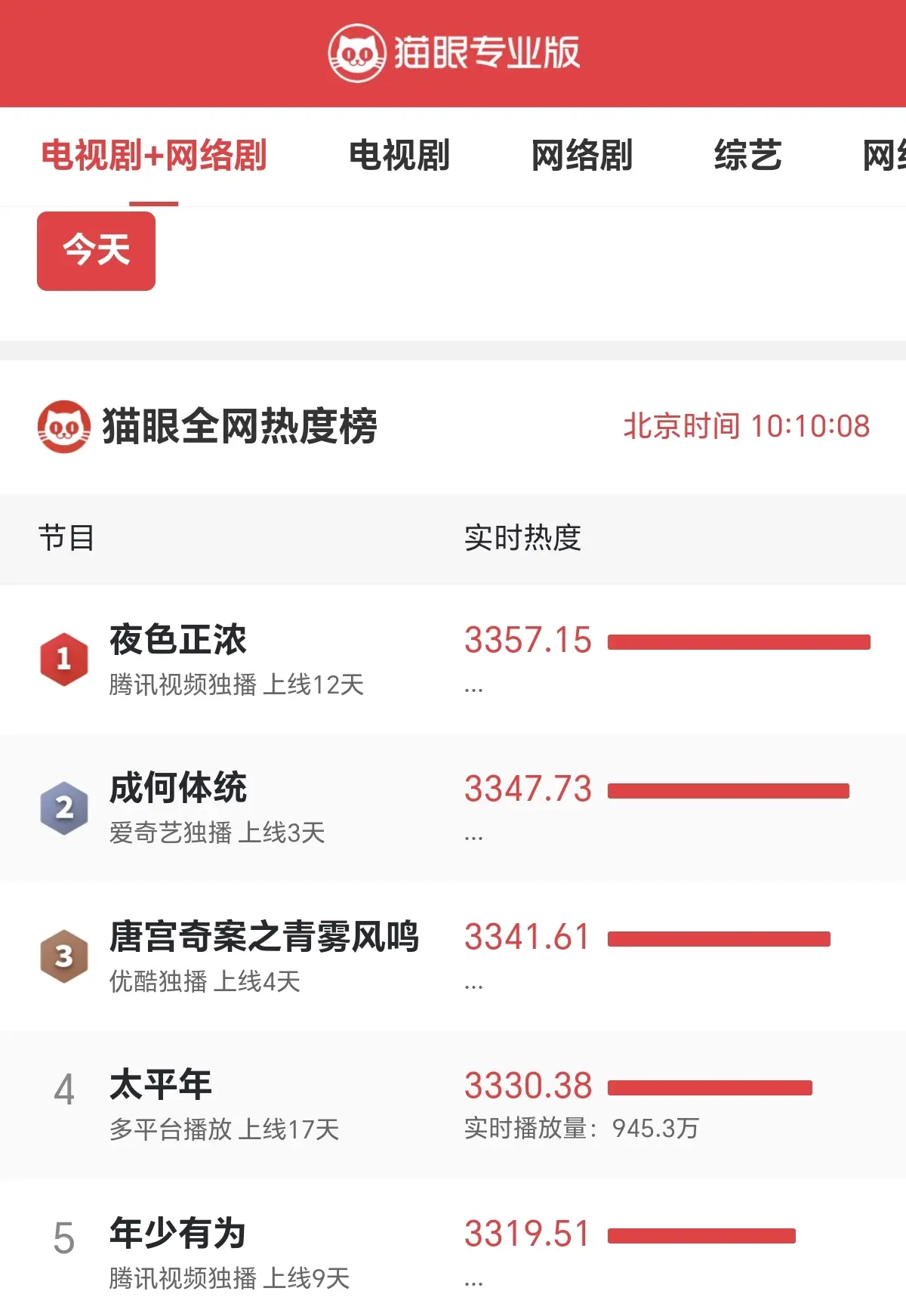松手2月8日上昼10时10分,从“猫眼专科版”及时数据显现可知,现时热播电视剧中,网播热度最高的五部剧区别如下: