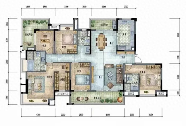 四房三卫的全明形状,完满适配三代同堂。主卧带零丁衣帽间、主卫与景不雅阳台,给主东谈主留足秘要与适意;长者房带零丁卫浴,起夜便捷,动线零丁不惊扰;书斋与次卧可生动打算为儿童房、书斋,功能切换解放,餍足全生命周期家庭需求。