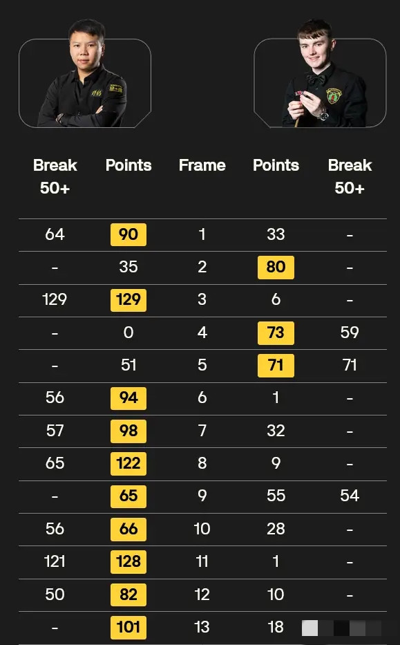 比赛开局阶段的走势特地胶著,首局周跃龙凭借单杆64分的阐扬,以90-33先声夺东说念主。第二局两边紧迫节律断断续续,麦奎根屡次上手主理契机,以80-35扳平比分。第三局周跃龙情景透顶开释,打出单杆129分的无缺破百,一杆制胜再度最初。神志在第四局和第五局出现回转,麦奎根接连打出单杆59分和71分,以3-2的比分反超敌手,赛场悬念转眼拉满。