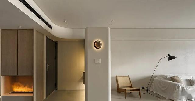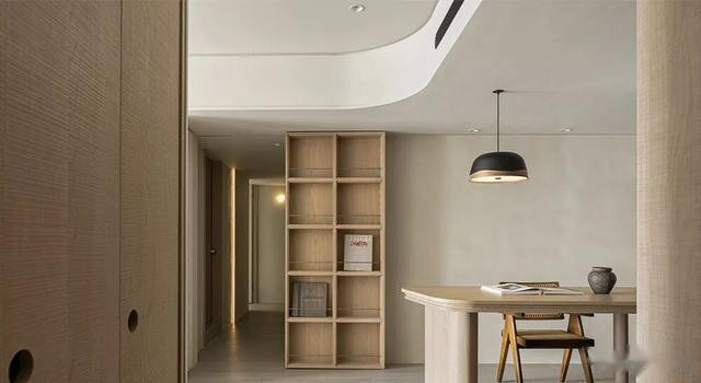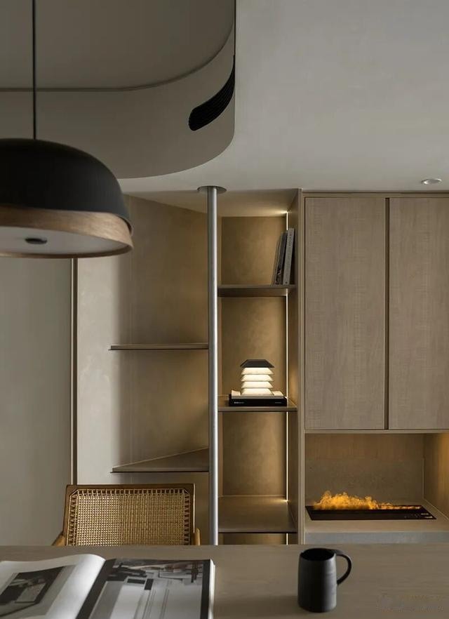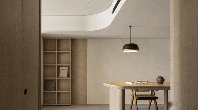 诀要在“光”和“触”:玄关一滑隐形鞋柜,门板是莱姆石粉作念的,手指蹭曩昔有细沙感,像摸到海滩;客厅那根大柱子没被包死,径直挖成旋转书架,顶上天花拉一都弧,灯带顺着走,光像领巾绕脖子,柔软却精细。