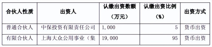 其中,“寰球公用”当作有限合推动说念主(LP),东说念主民币货币(现款)姿首认缴1.9亿元,占比95%;中保投资有限包袱公司当作平时合推动说念主(GP)出资1000万元,占比5%。